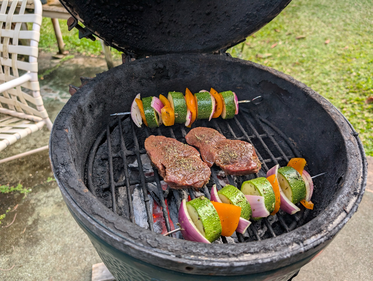 Meat and vegetables on the grill.