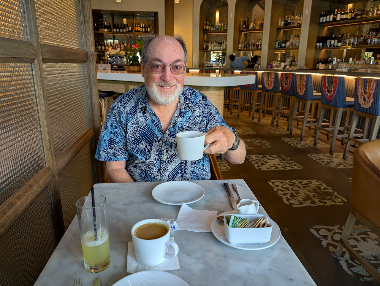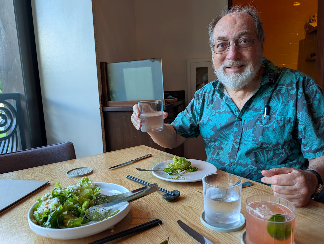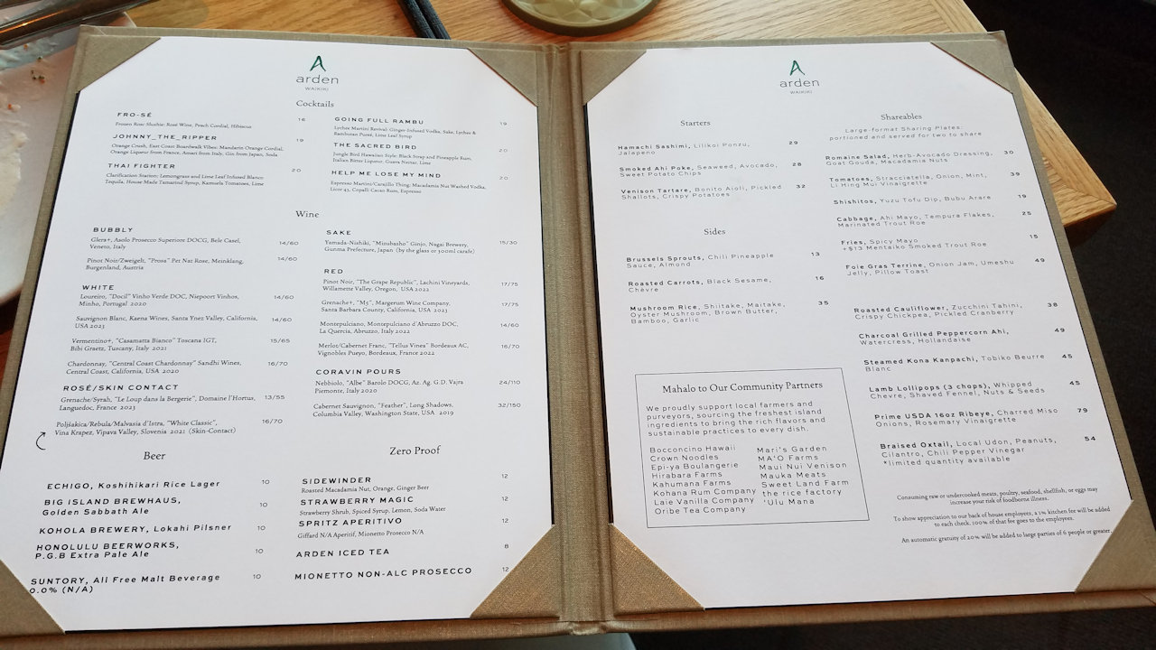 Midway through a week of celebrations, we decided to combine birthday and anniversary into one delicious evening out at a favorite destination. Arden did not disappoint. The romaine salad was delicious, as was the steamed kanpachi. Beverages were delicious (I can recommend the Sacred Bird and the French press coffee). We enjoyed watching the Kapiolani Park scene.