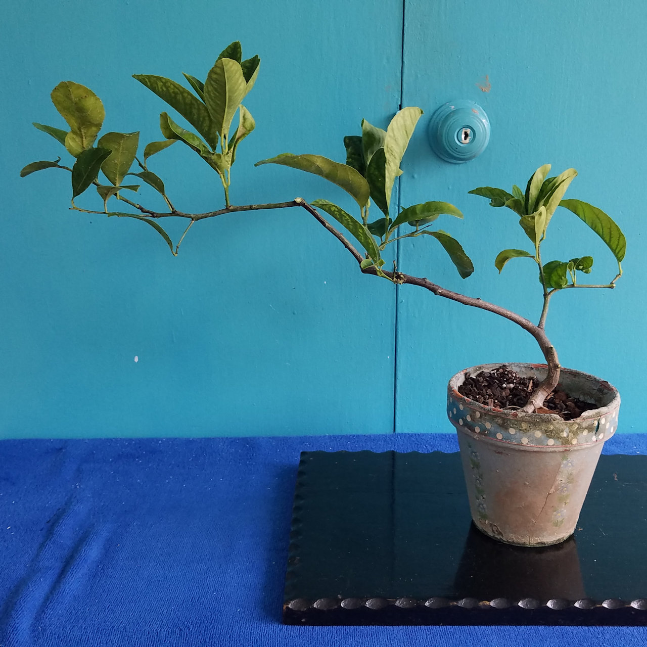 Monday morning, the 30th, last day of June, I photographed my bonsai plumeria, from a cutting and in the bonsai pot for about six years.