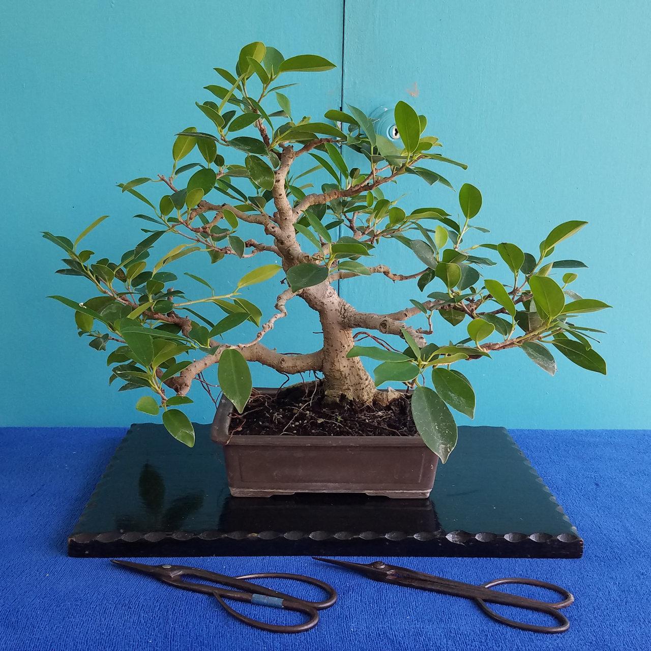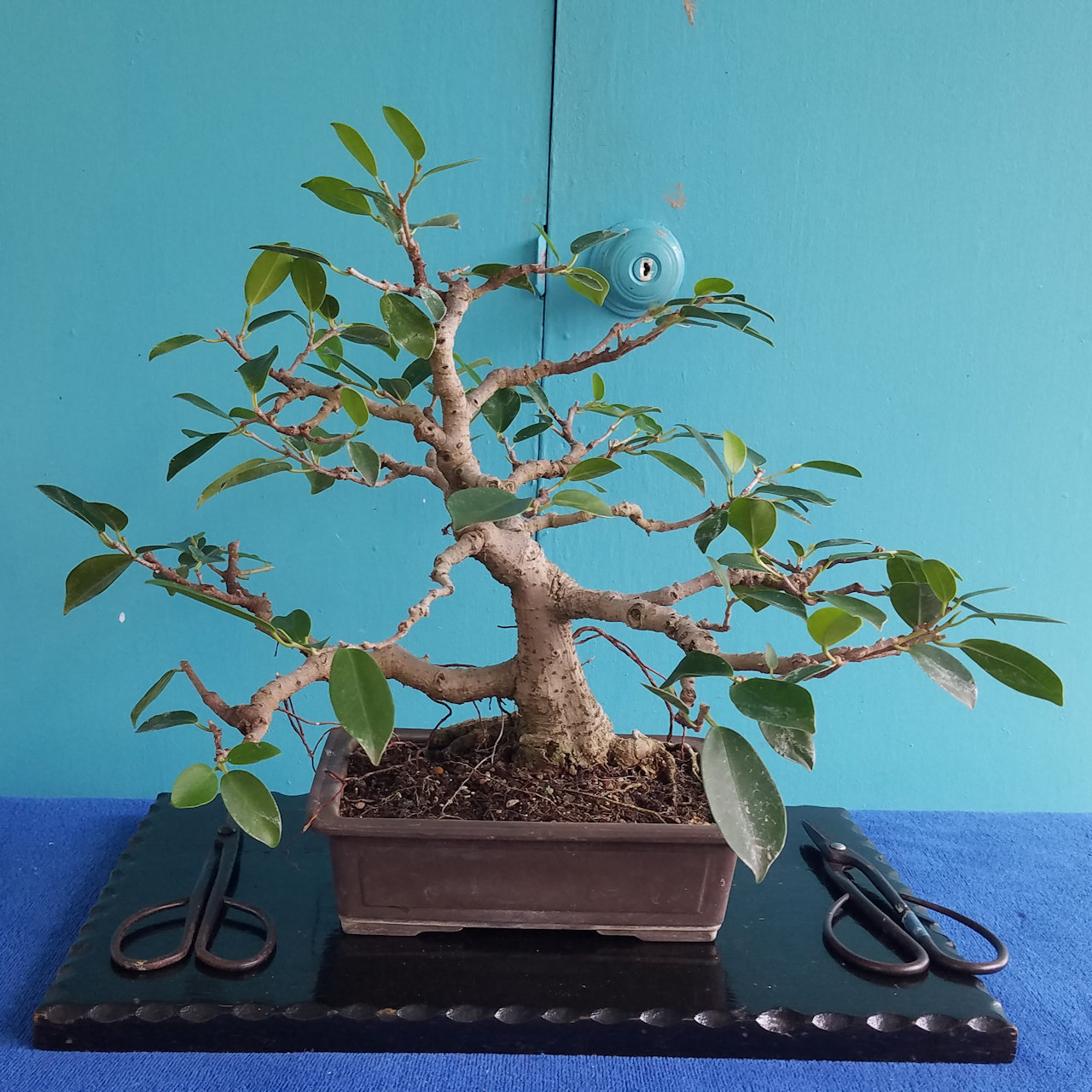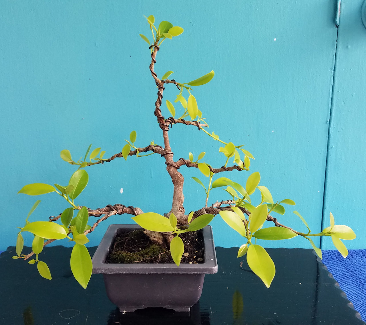 This is Andrea's ficus bonsai after leafing out after defoliation and restyling.