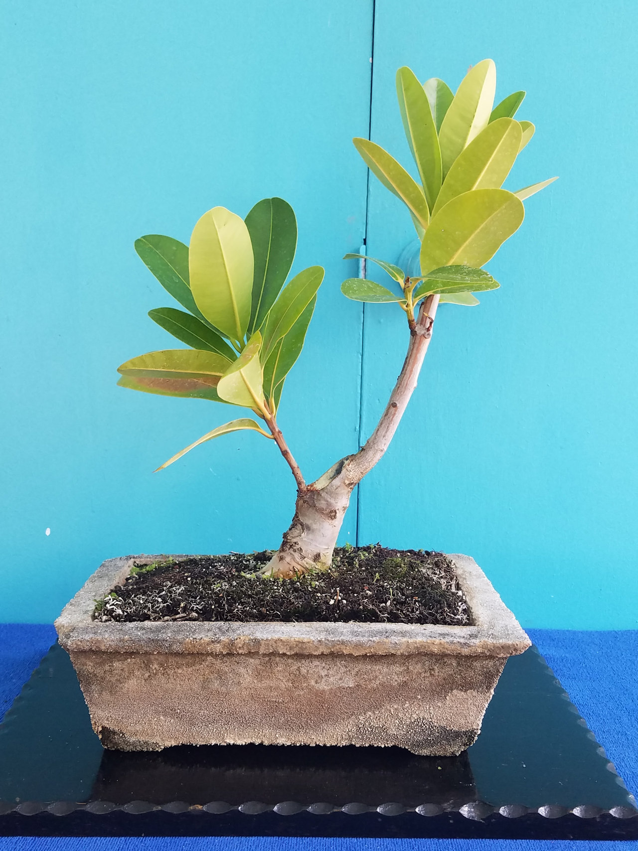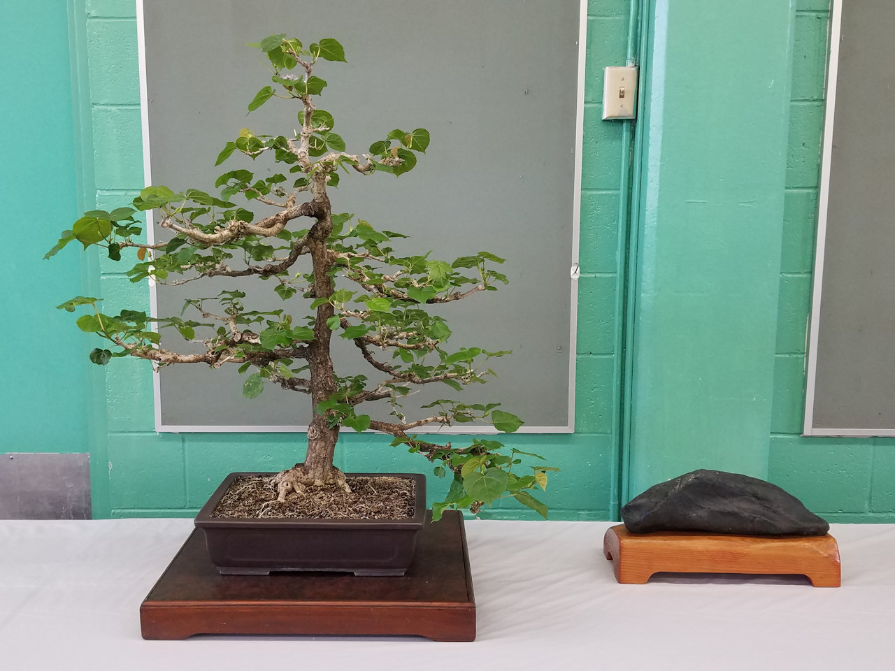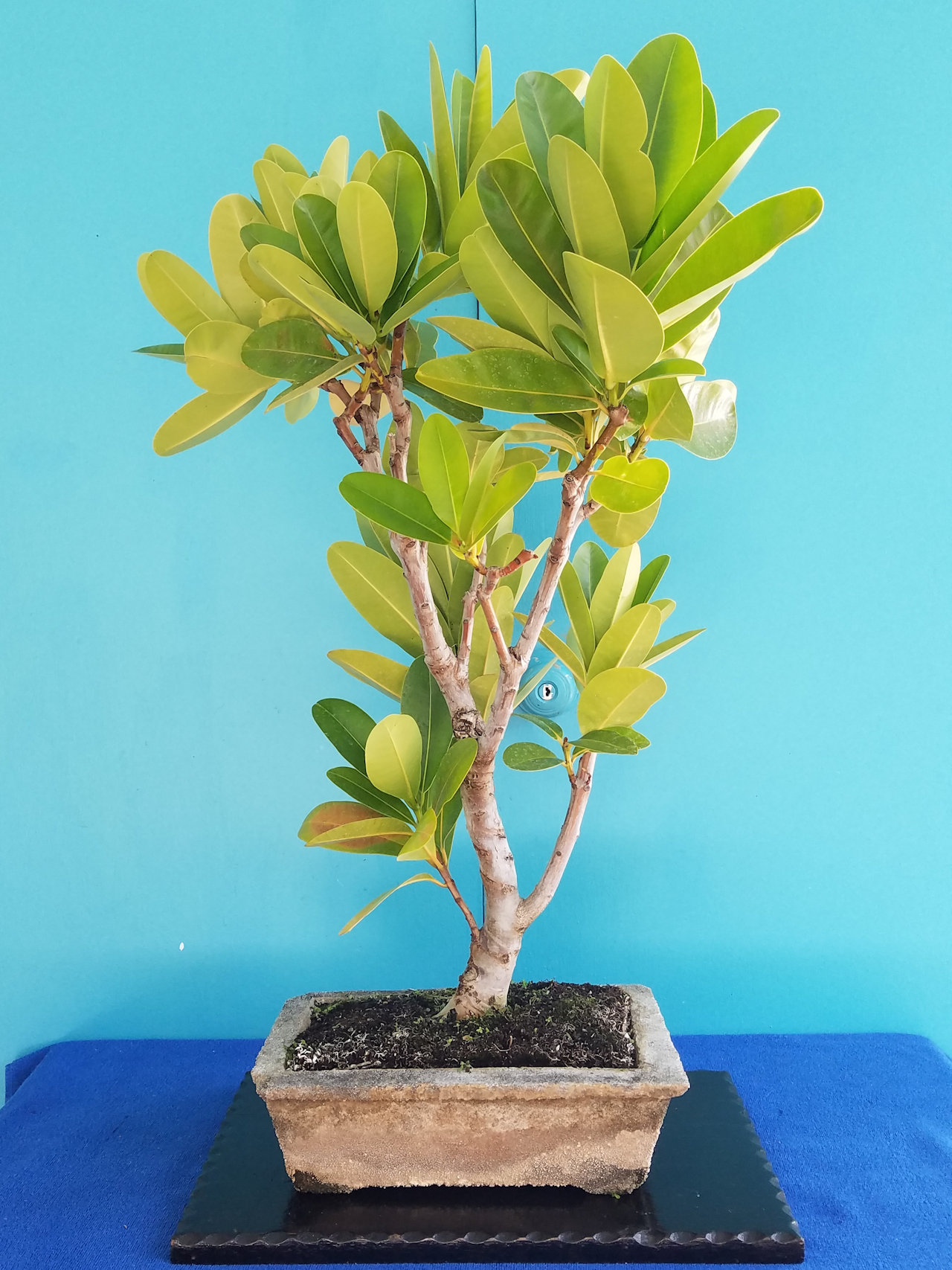 This is Andrea's ficus bonsai after leafing out after defoliation and restyling.