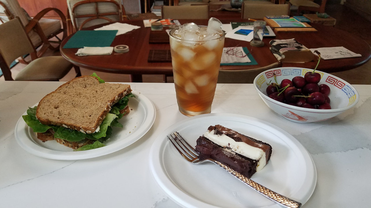 at the Hula Camp week at Mānoa Heritage Center. I made a duck sandwich, a slice of cake that Paul and Faye gave us, and a bowl of cherries.