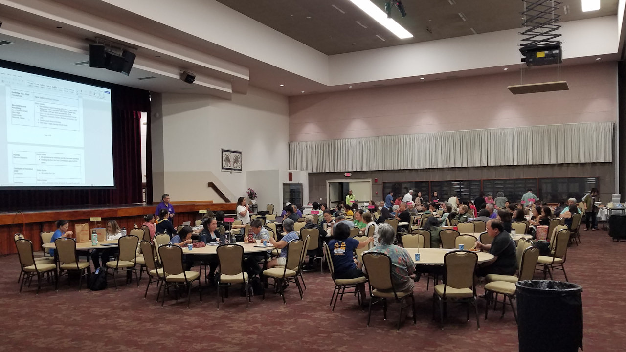 The meeting got underway while people were still getting plates from the potluck tables in the back.