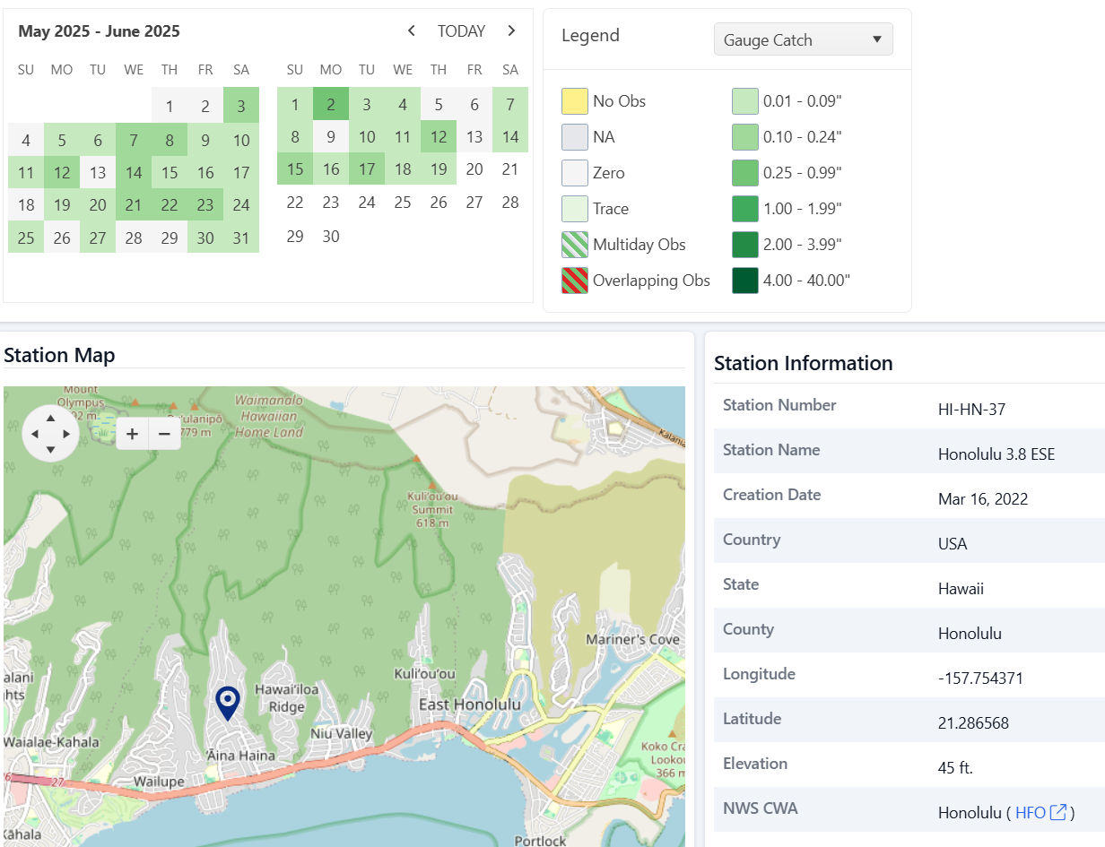 Rainfall statistics for my station on CoCoRaHS, the "Community Collaborative Rain, Hail and Snow Network."