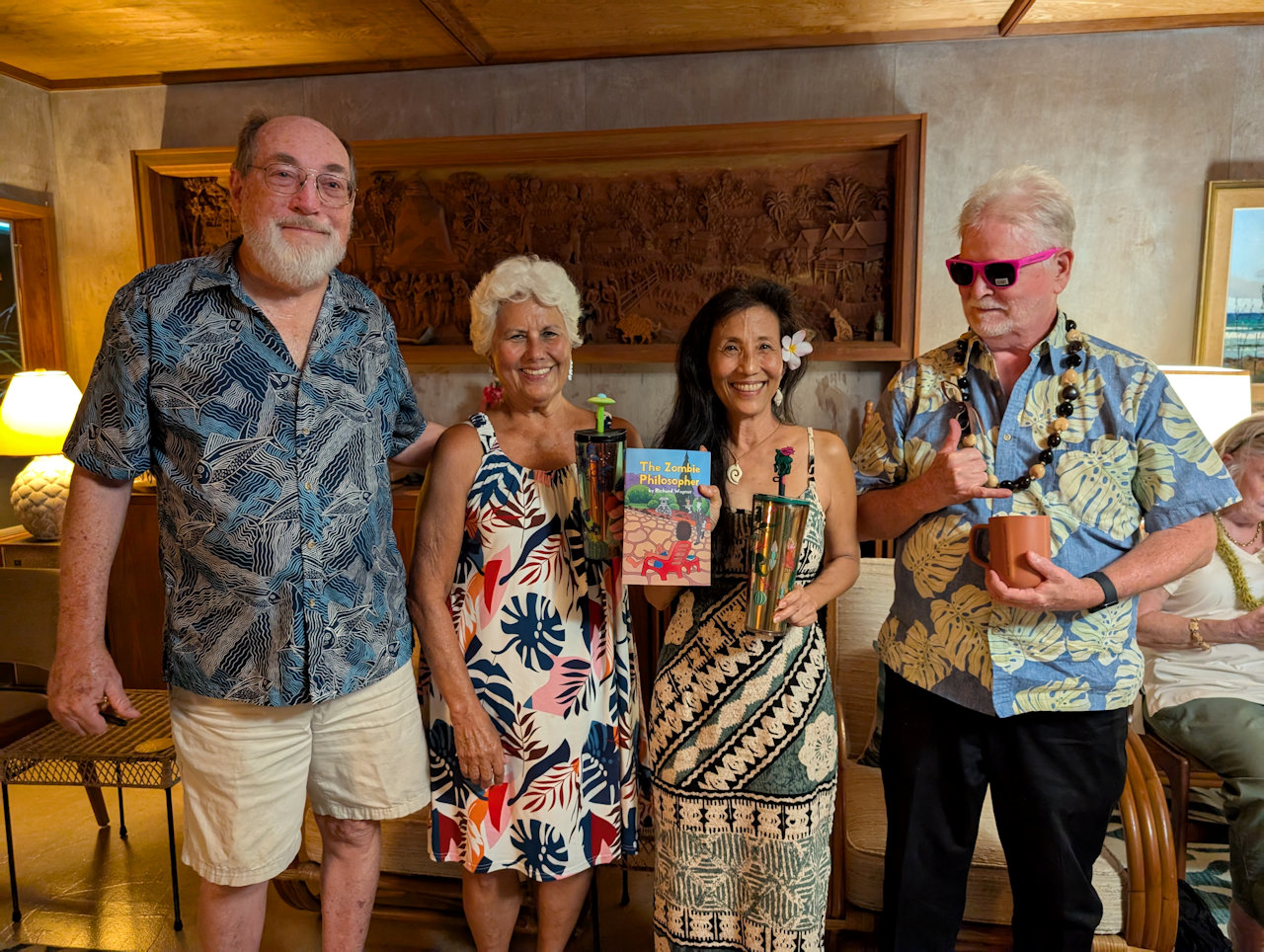 with signed copy of my novella and Starbuck's cold drink cup, and Matt, third place with Starbuck's large coffee cup and Planned Parenthood pink sunglasses.