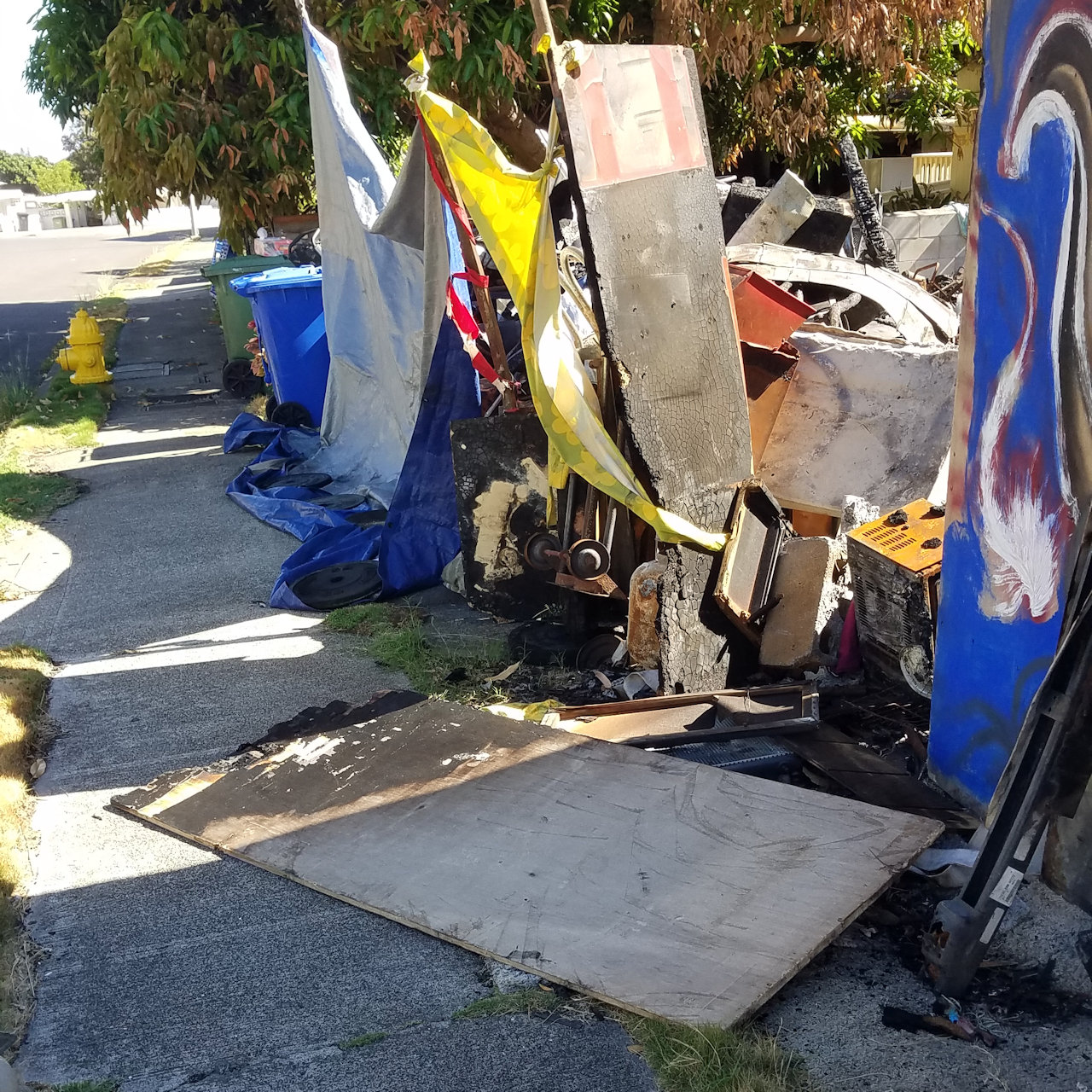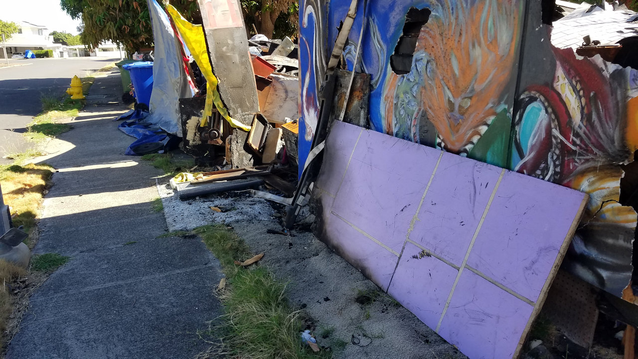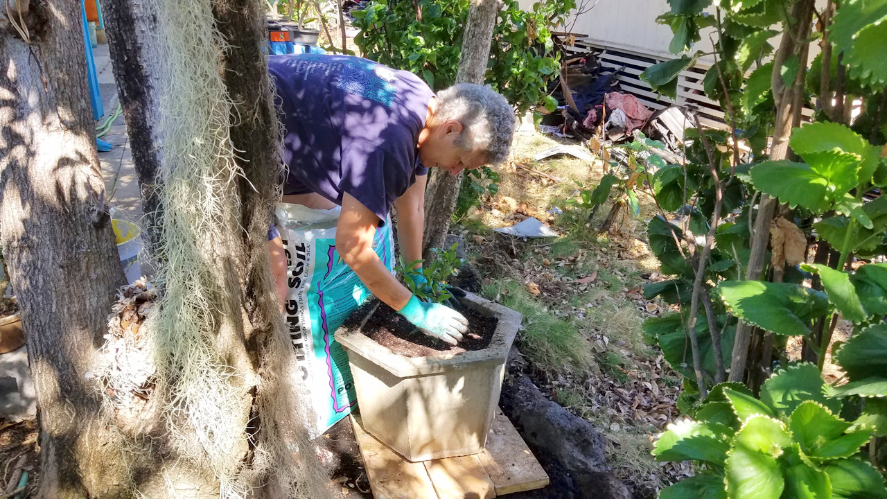 On Monday Andrea moved a large concrete pot to block access to the burned out house next door and planted a native aʻaliʻi in it.