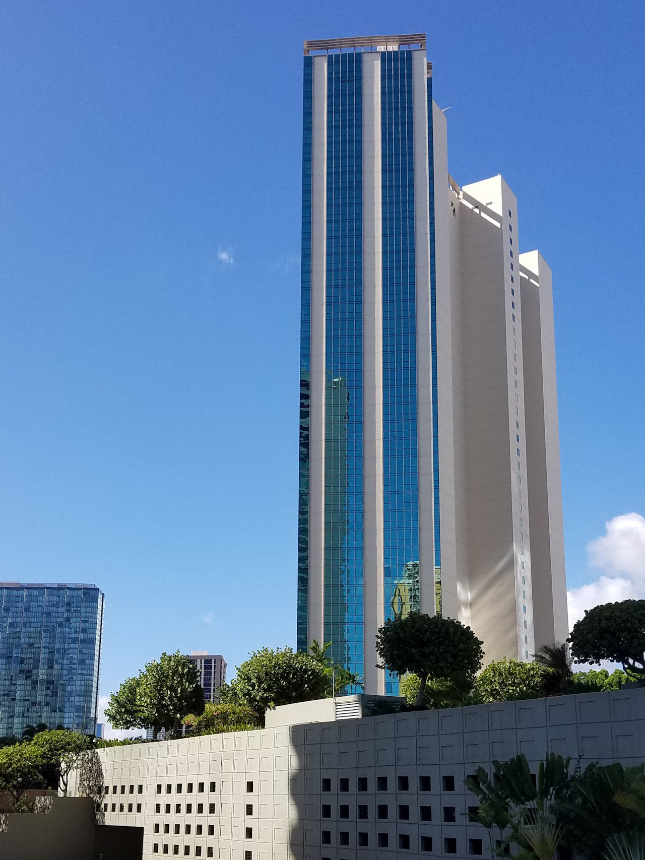 A view from outside the eye doctor's office. The tall building is a condominium.