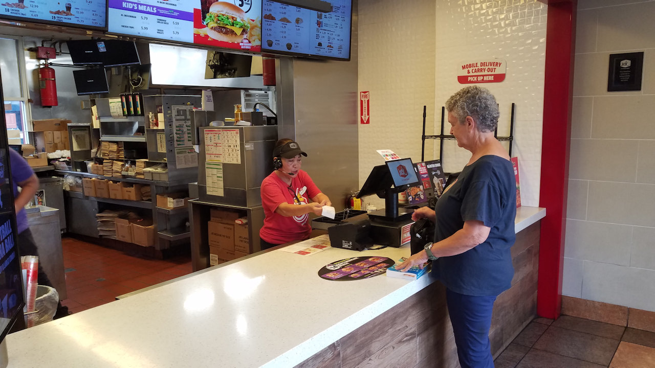 We dropped off the car at the service entrance just after seven and walked to Jack in the Box for breakfast.