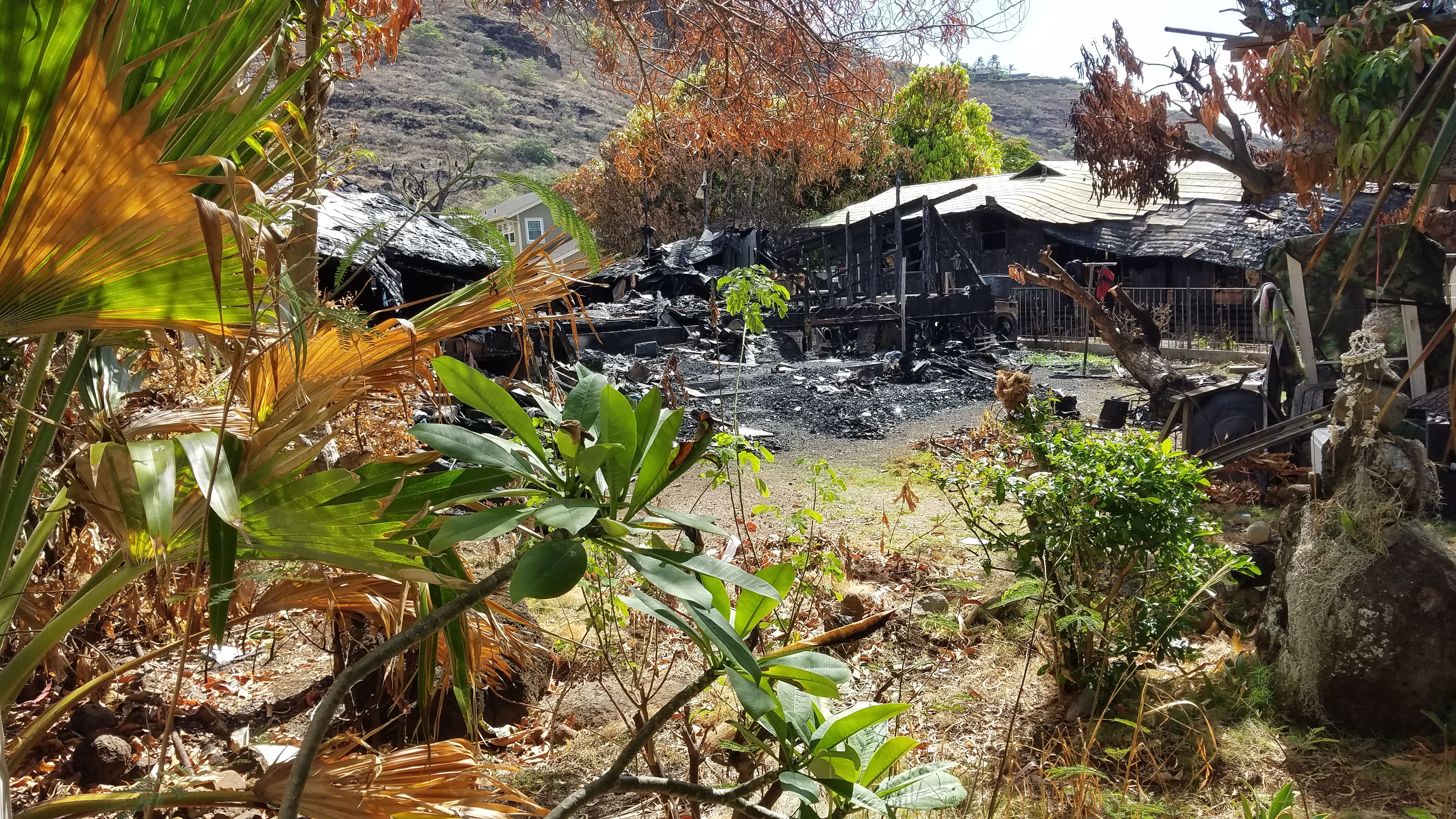 The burned down house is barricaded on both sides and the front. On the far right is a burned out appliance with a big washer tub on top, blocking