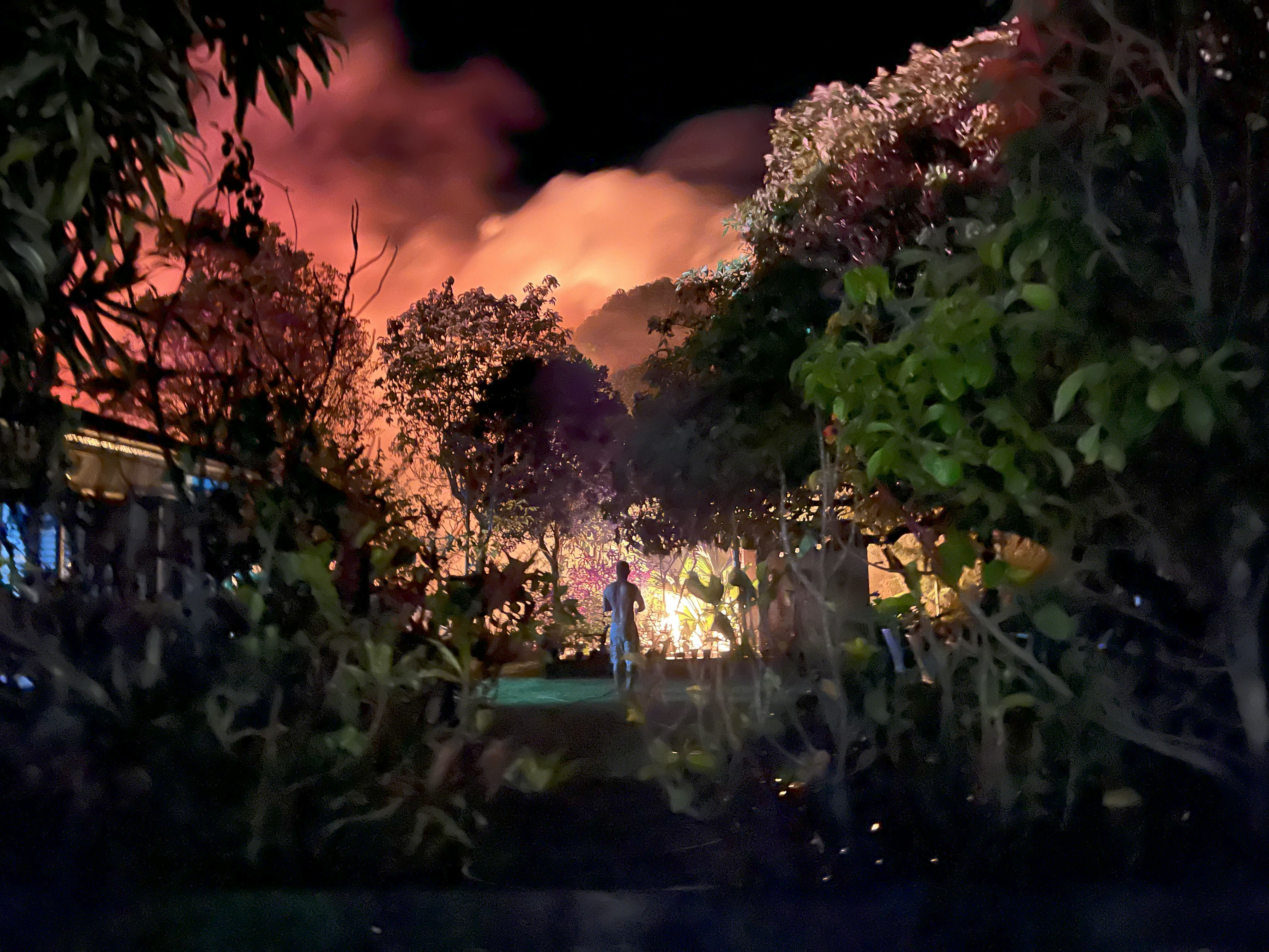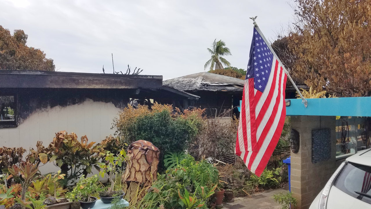 The idiot next door burned down his own house. Andrea and I used garden hoses to keep it away. Our house is okay.