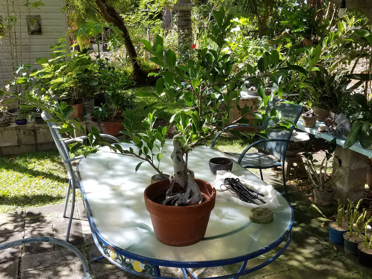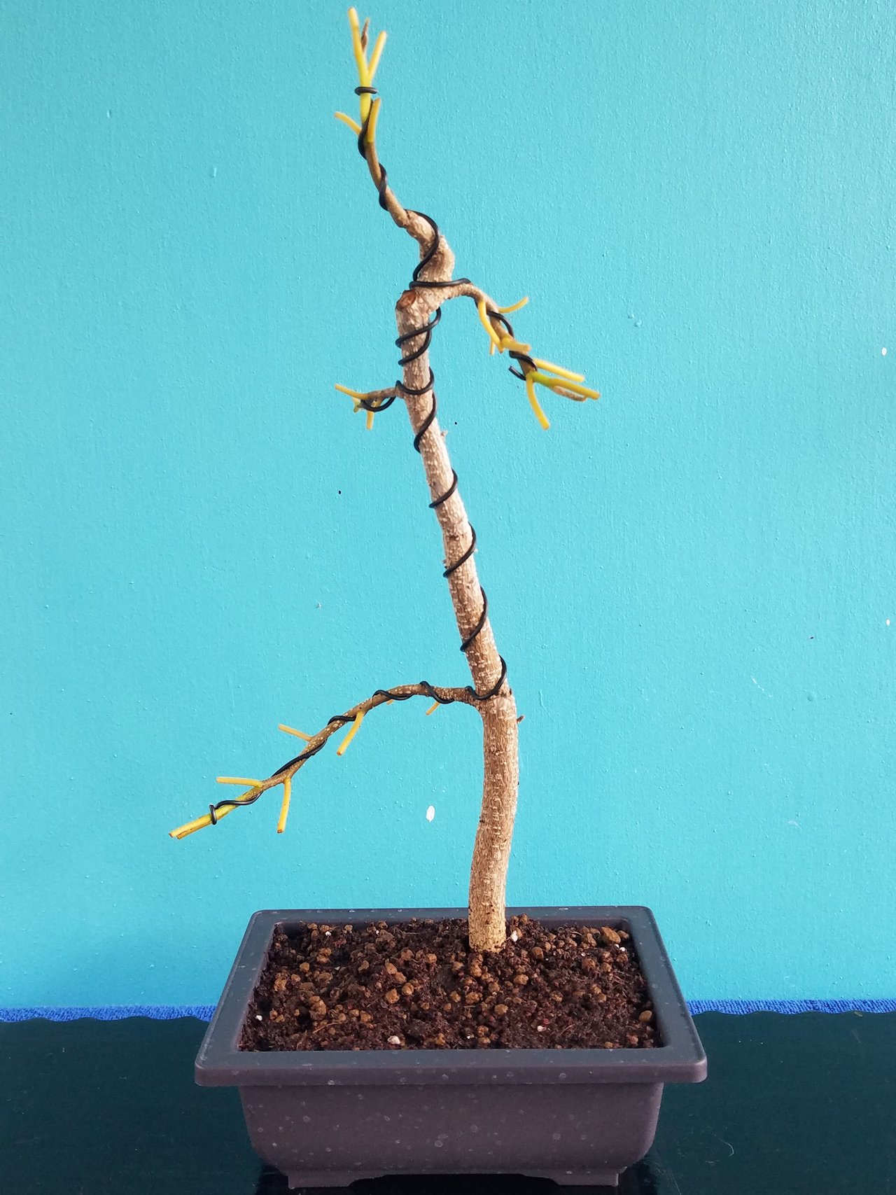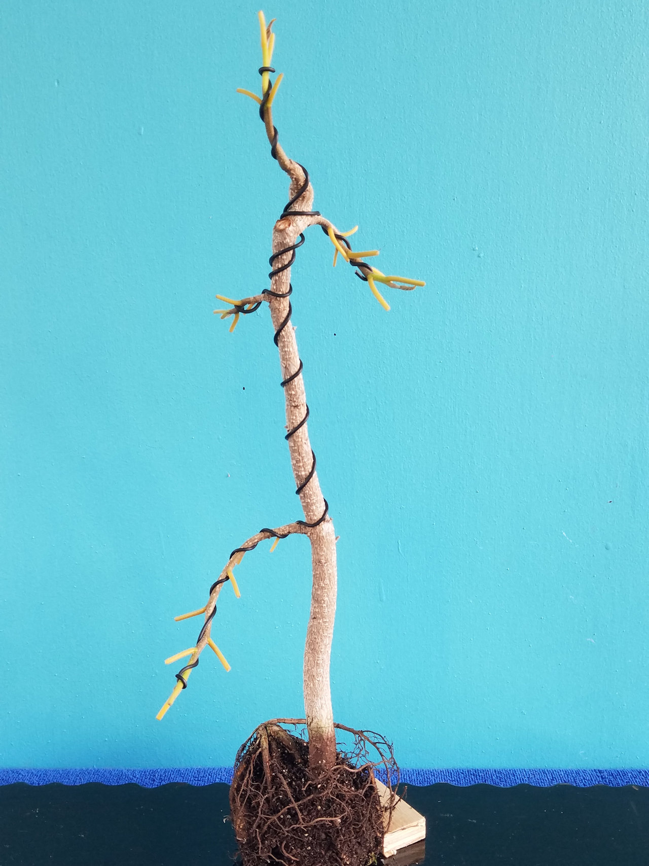 The bonsai banyan after trunk and branch bending held with wire stays. This tree will grow for a few months and the wire will be removed.