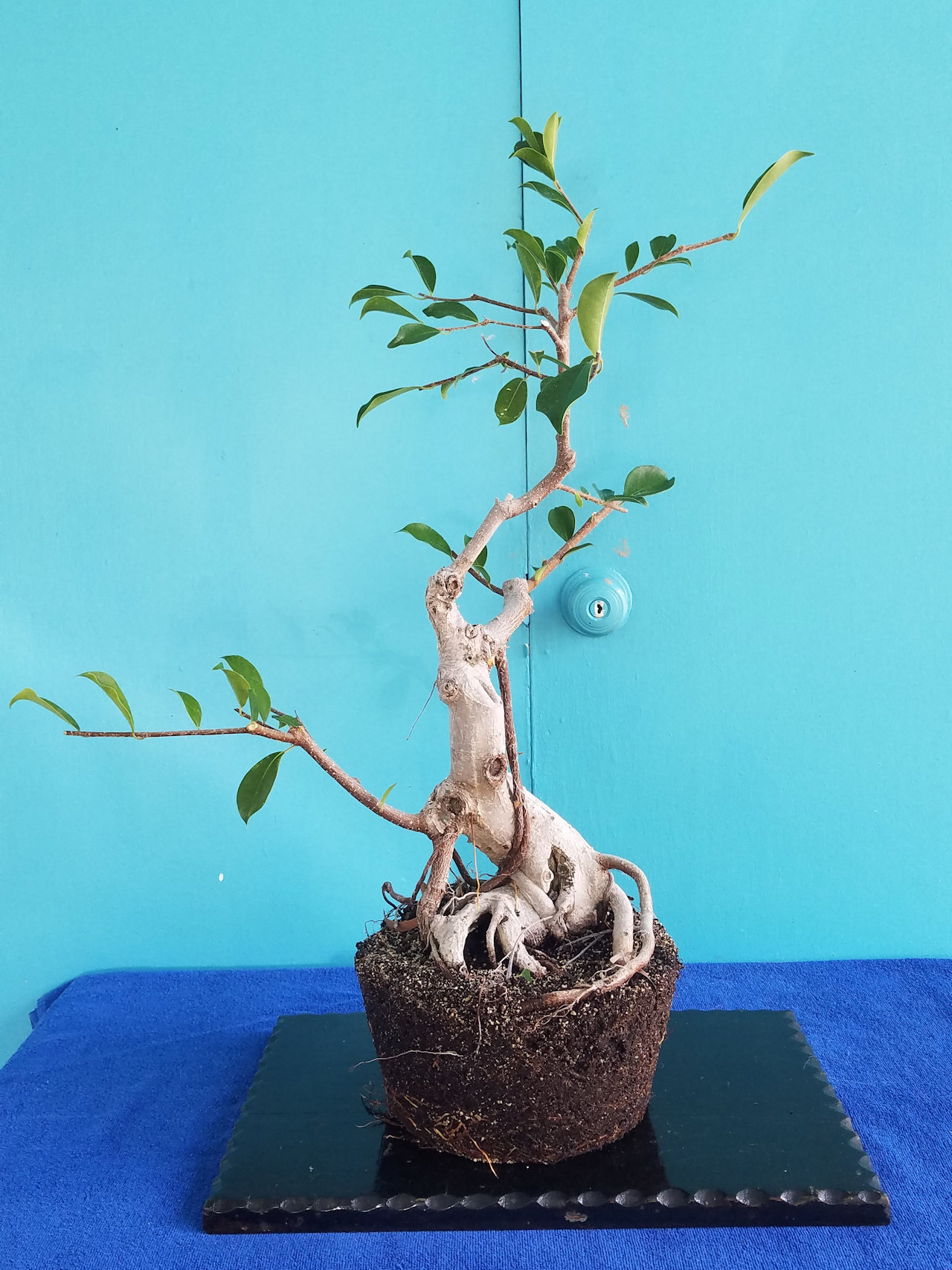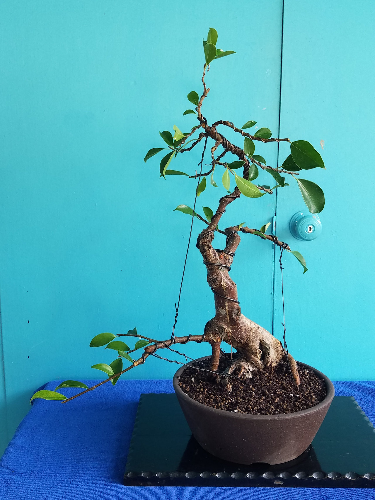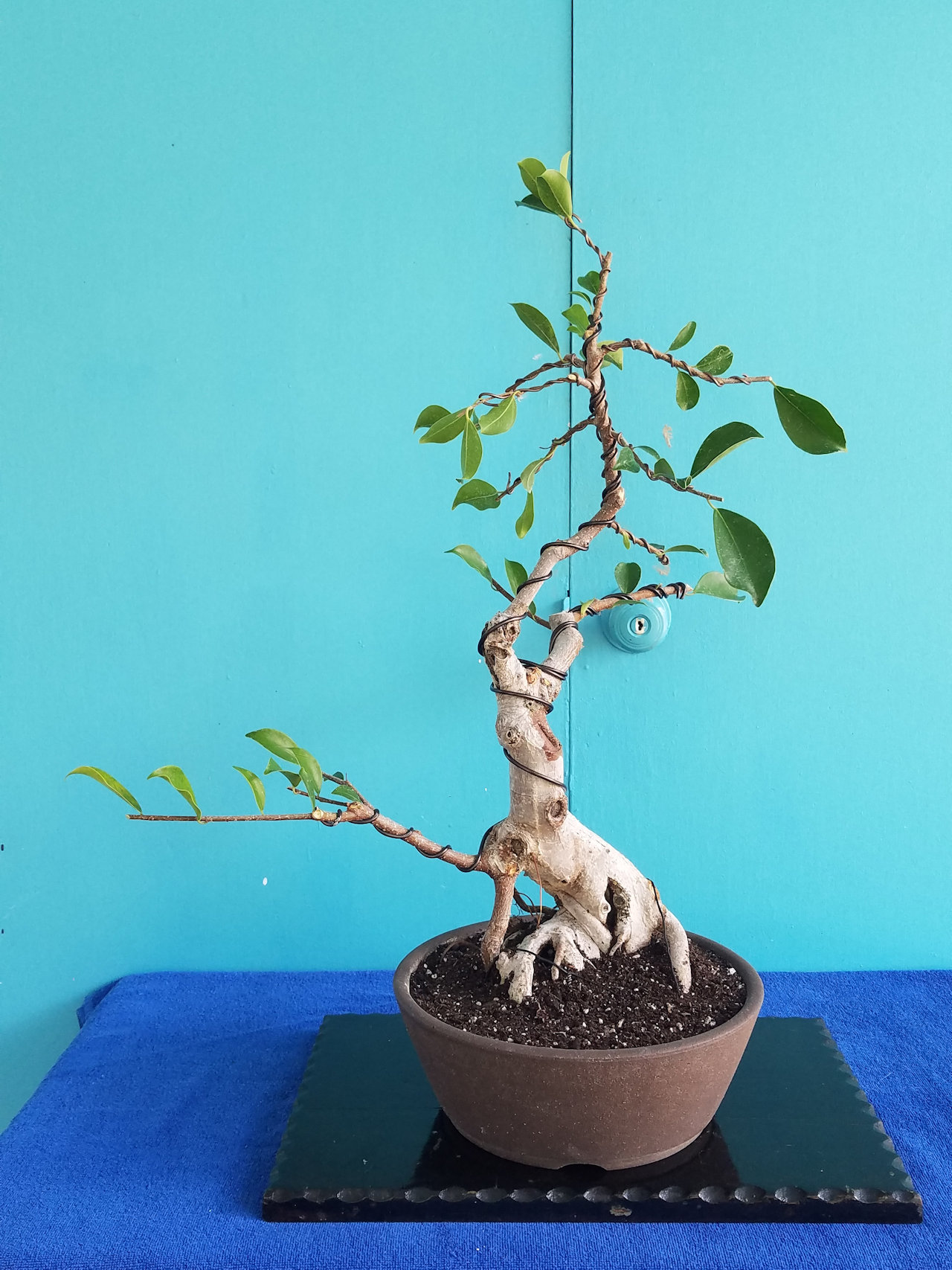 Some aerial roots have been removed, wire added, and potted into a ceramic circular bonsai pot.