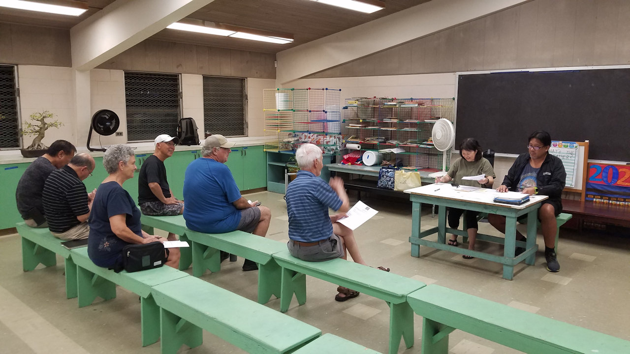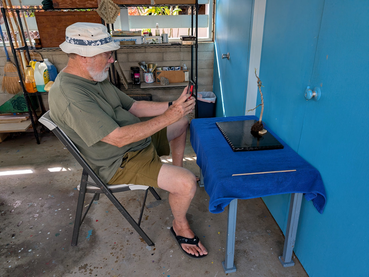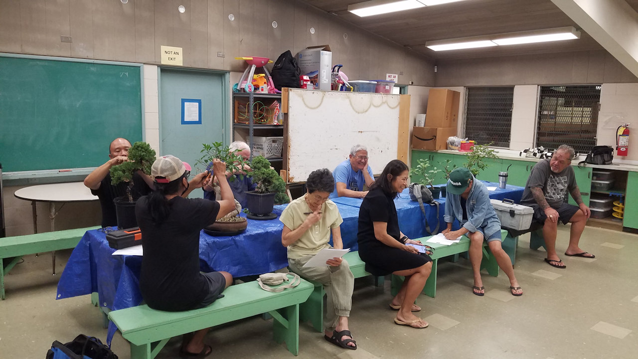 Working on bonsai in the back while the business is conducted up front.