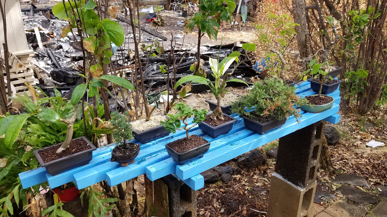 I rebuilt the bonsai shelf that got knocked over by the firefighters who saved our house.