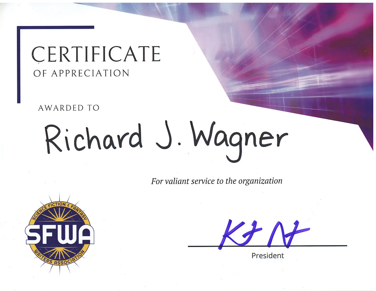 Today I received a certificate of appreciation from the Science Fiction Writers of America for being on their Emerging Technologies Committee.