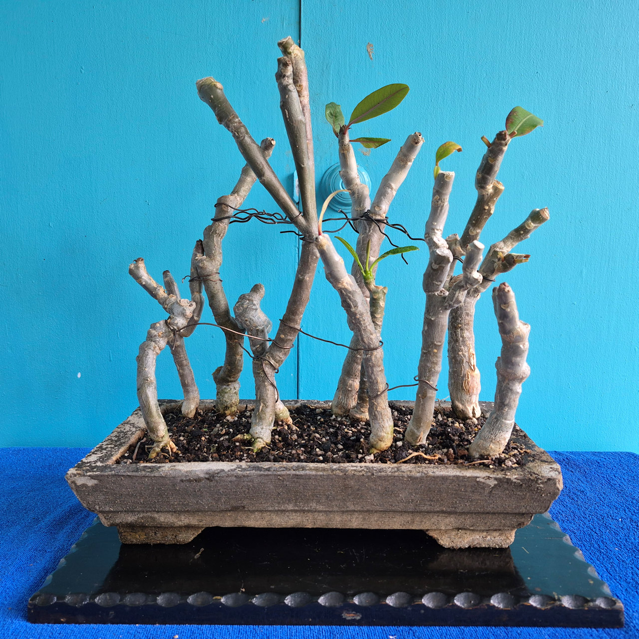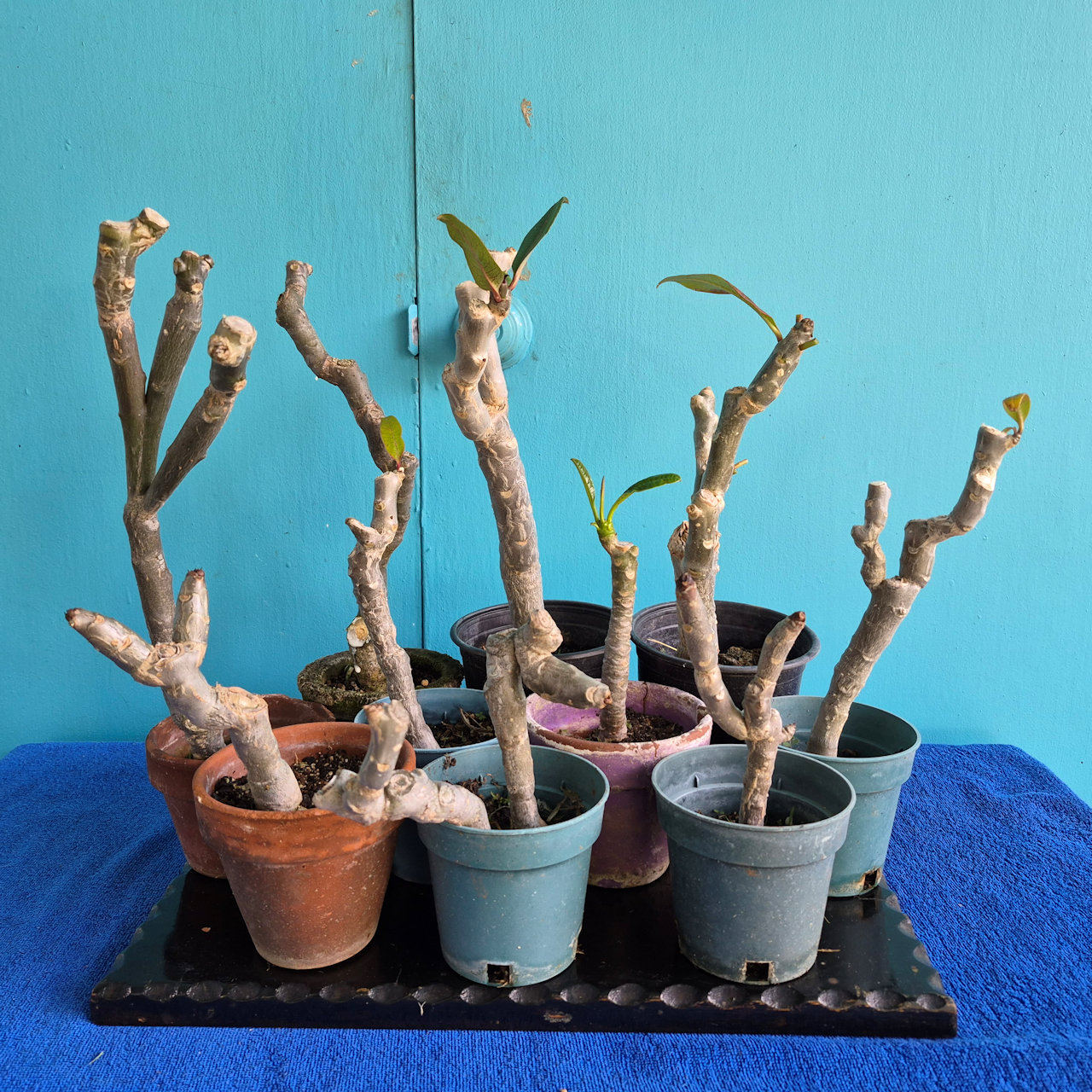 Eleven plumeria trees from seed for a bonsai forest, photographed Tuesday, March 3rd.