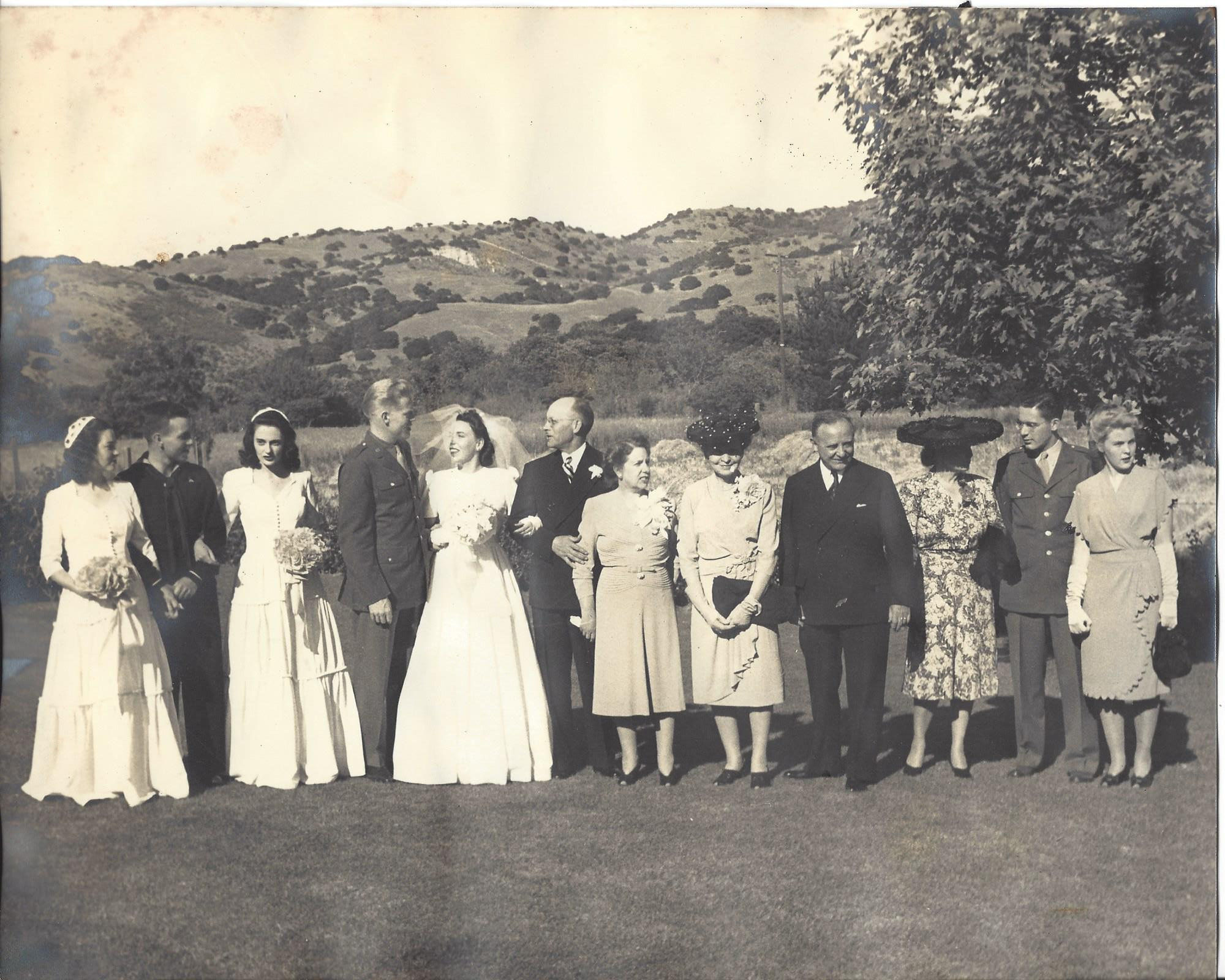 My parents' wedding at the Reeves ranch in Corral de Tierra in 1945. Dug up by Google from my backups. Click the image for the full resolution version.