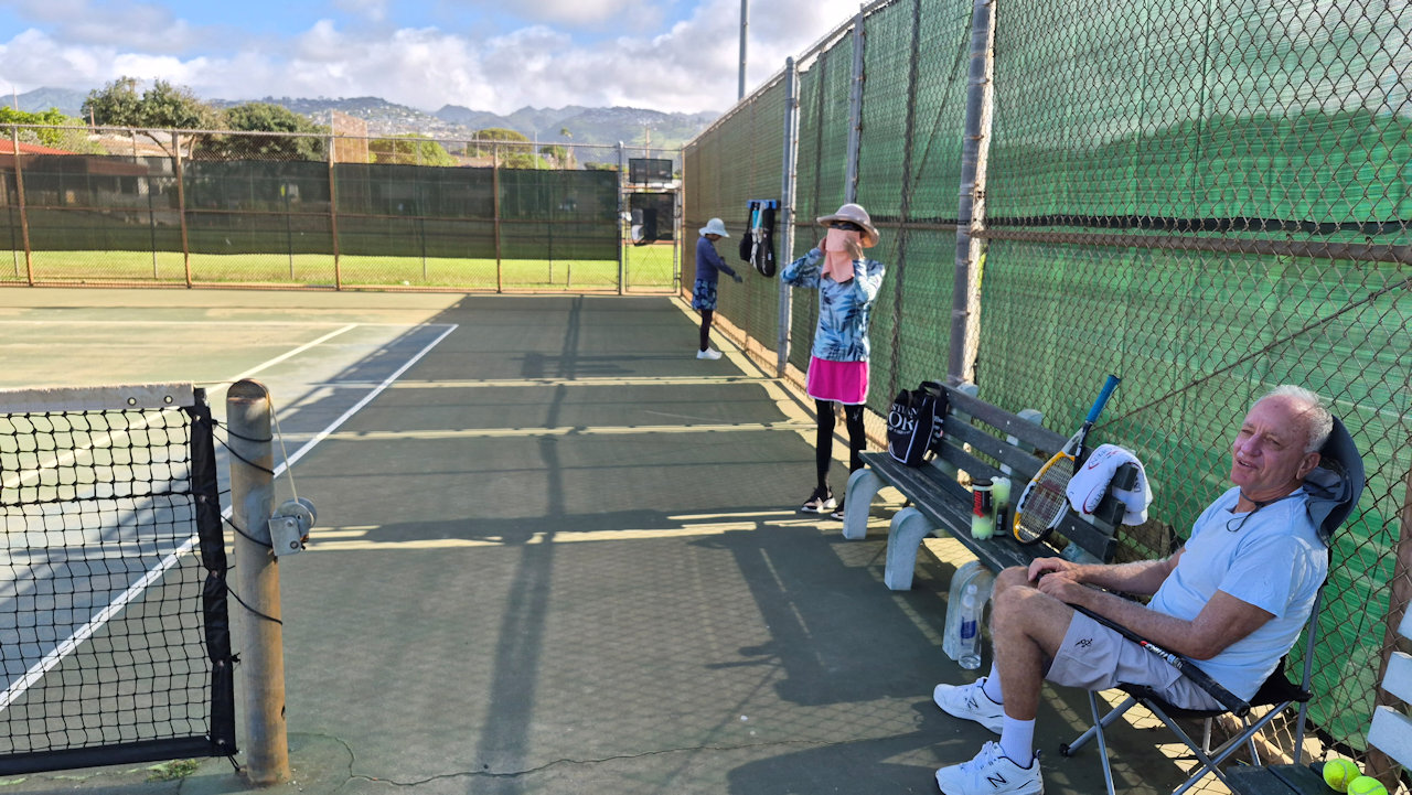 Getting ready to play tennis on Thursday morning, March 5, while Andrea gave tours at Mission Houses.