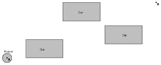 Solution: The robot is confined to the surface of the earth, and the parking lot is somewhat flat. Model the parking lot as a geometric horizontal plane. Model the cars as rectangles of width and length equal to the cars they represent. Model the robot as the smallest circle the actual robot can stand in while walking.