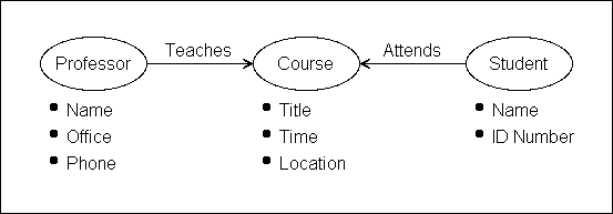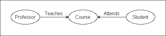 Solution: Represent the model as a graph with entities (nouns) at the nodes (vertices) and relationships (verbs) as directed edges. The nouns are professor, course, and student. The verbs are teach and attend. Draw and label the graph: