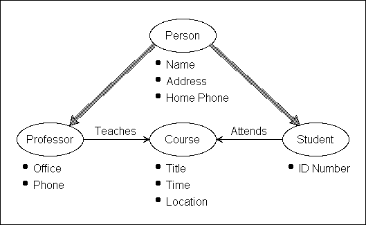 Now we call the entities objects. Add a "person" object and the "is-a" (inheritance) relationship (denoted by heavy gray arrow):