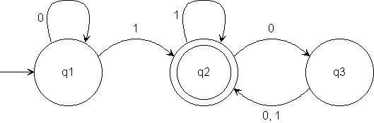 A finite automaton can be represented by a state diagram that has a set of states, one a start state (input arrow), and zero, one, or several accept (final) states. Transitions from one state to another are represented by directed edges. The input is a string, and the output is either accept or reject.